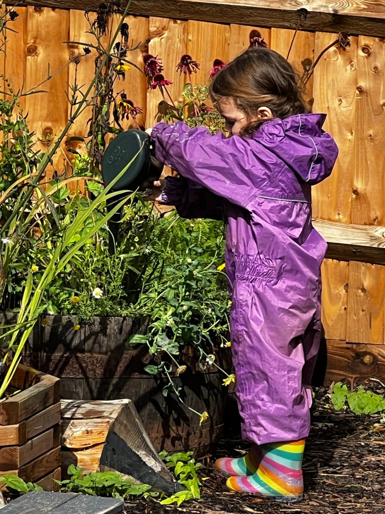 We have a small plot of land on site. It’s our project biodiversity garden. Our intention is to bring a pocket more of biodiversity to the urbanised area and create a natural play setting outdoors for attending children. Children can experience stewardship helping it to thrive and grow, improving local wildlife conservation, and protecting the natural world balanced with lots of opportunities for play. Through doing so, the children develop a sense of place here and the agency of the garden with first-hand experiences that provide them with life skills to champion their own health and well-being, combat the climate crisis, and experience an eco-friendly lifestyle.